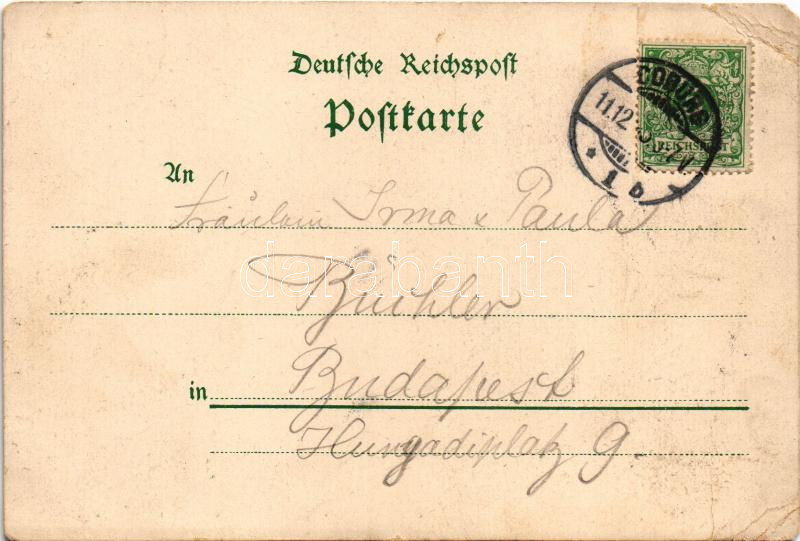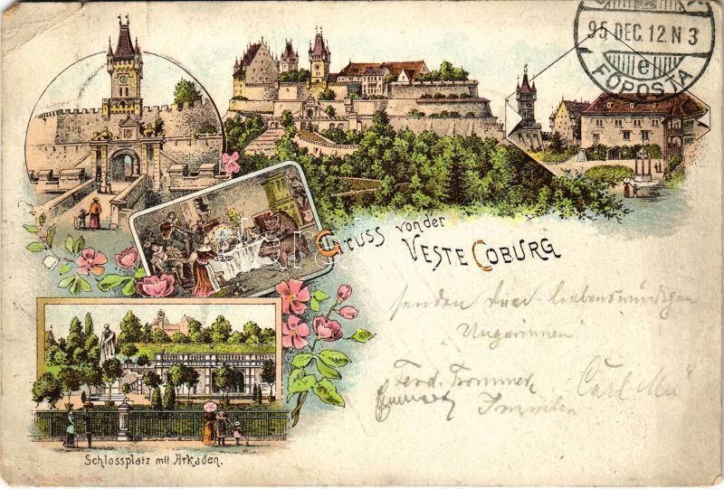 Beschreibung: 1895 (Vorläufer) Coburg, Gruss von der Veste Coburg, Schlossplatz mit Arkaden / castle, bears. Art Nouveau, floral, litho (EB)