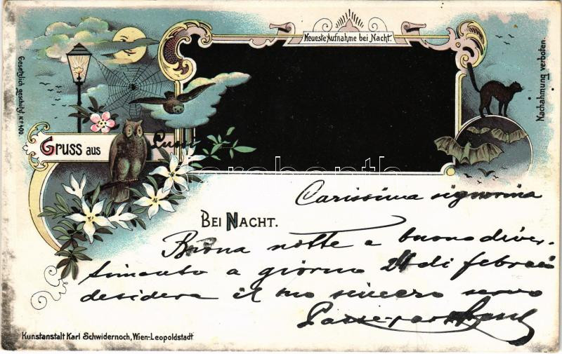 1898 (Vorläufer) Gruss aus bei Nacht, Neueste Aufnahme bei Nacht. Kunstanstalt Karl Schwidernoch / Szecessziós esti üdvözlet / Art Nouveau floral litho night greeting (EK)