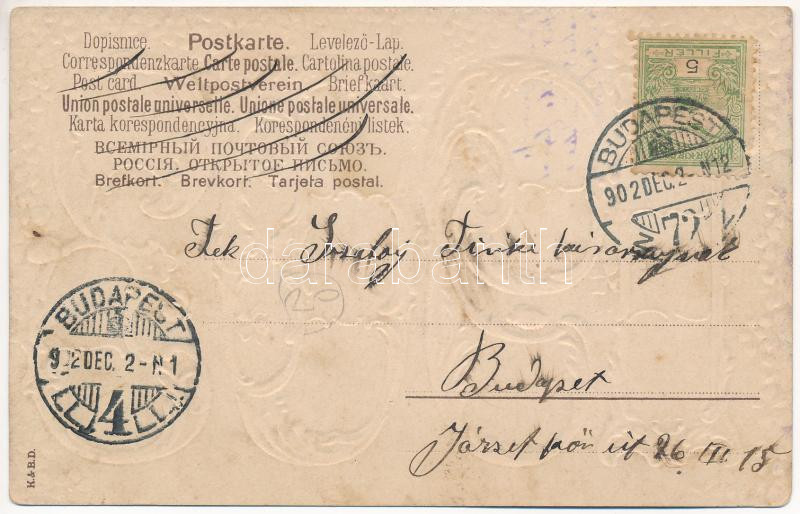 1902 Szívélyes üdvkívánataimat! 1903. Szecessziós dombornyomott újévi üdvözlőlap katicákkal és naptárral / New Year greeting art postcard with ladybugs and calendar. K. & B. D. Art Nouveau Emb. Floral (kis szakadás / small tear)