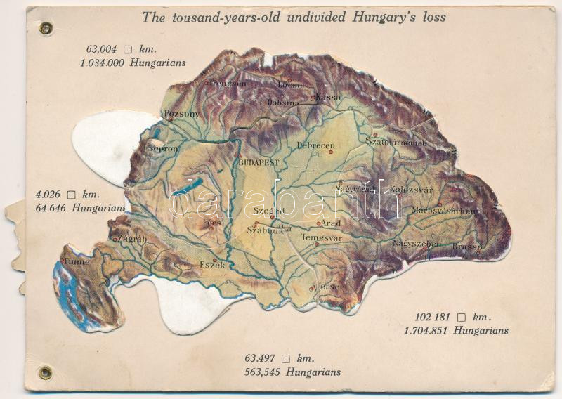 Az ezeréves egységes Magyarország - mechanikus térképes irredenta lap az elszakított területekkel. Magyar Asszonyok Nemzeti Szövetsége kiadása / "The thousand-years-old undivided Hungary's loss" Map of Hungary, Irredenta mechanical postcard. Published by the Hungarian Women's National Association (EK)