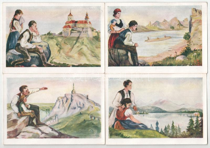 Irredenta képeslap sorozat (8 db): Fraknó, Dévény, Vágvölgy, Csorba-tó, Kolozsvár, Zimony, Vaskapu-szoros, Trianoni határkő. Kiadja a Magyar Nemzeti Szövetség, Don Bosco Nyomda / Hungarian irredenta propaganda art postcard series (8 pcs): Forchtenstein, Devín, Povazie, Strbské pleso, Cluj, Zemun, Portile de Fier, Trianon border s: Márton L., Nógrády M.