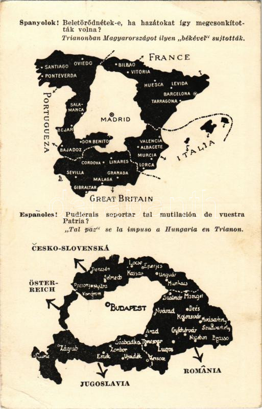 Spanyolok! Beletörődnétek-e, ha hazátokat így megcsonkították volna? Trianonban Magyarországot ilyen "békével" sújtották. Magyar Nemzeti Szövetség kiadása, térképek / Spain after an imagined Trianon. Hungarian irredenta maps (EK)