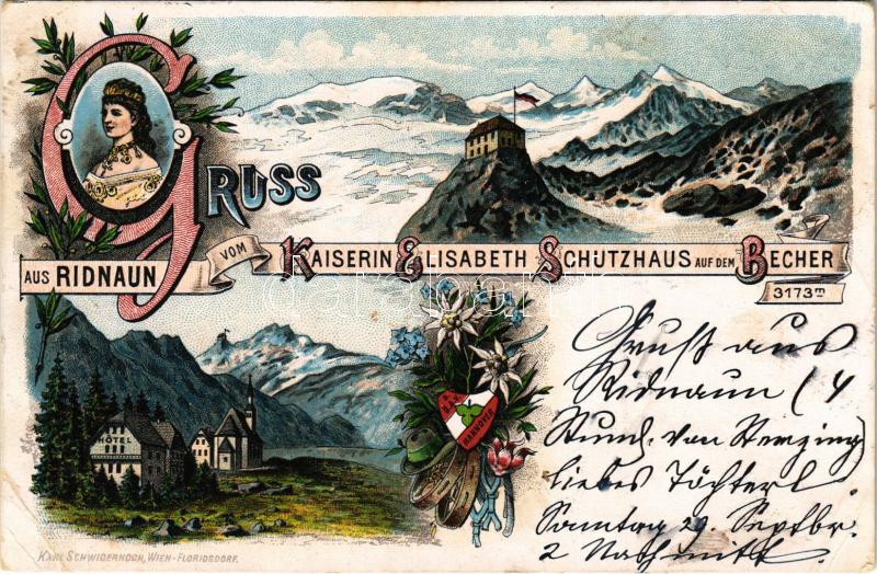 1905 Ridanna, Ridnaun (Südtirol); Gruss vom Kaiserin Elisabeth Schutzhaus af dem Becher / Rifugio Gino Biasi / mountain rest house. Karl Schwidernoch Art Nouveau, floral, litho (EB)