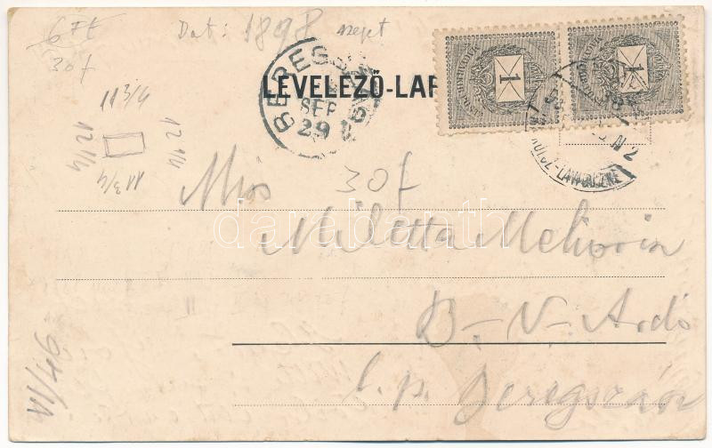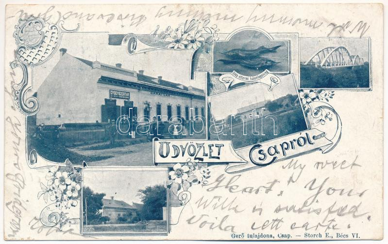 Beschreibung: 1898 (Vorläufer) Csap, Cop, Chop; Garai Lak, gyógyszertár, híd, éttermi különlegesség (halak). Storch E. kiadása / pharmacy, bridge, restaurant's specialty (fish). Art Nouveau, floral (EK)