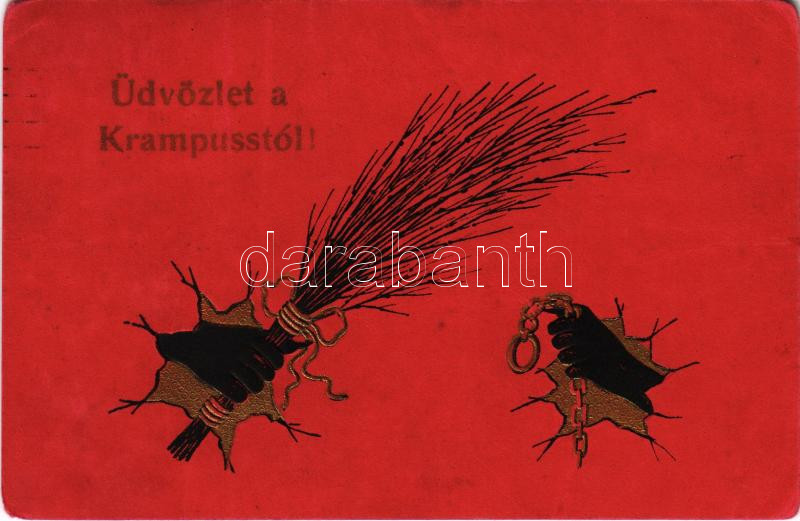 1917 Üdvözlet a Krampusstól! / Greetings from the Krampus with birch a... https://www.darabanth.com/de/41-Gross-Auktion/41.1/Ansichtskarten/Krampus~16983/1917-Udvozlet-a-Krampusstol-Greetings-from-the-Krampus-with-birch-and-chain-Emb-litho-kopot~II3008347