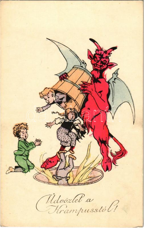 Üdvözlet a Krampusztól / Krampus pours a bucket of children into hell.... https://www.darabanth.com/de/41-Gross-Auktion/41.1/Ansichtskarten/Krampus~16983/Udvozlet-a-Krampusztol-Krampus-pours-a-bucket-of-children-into-hell-HHiW-Nr-696~II3008384