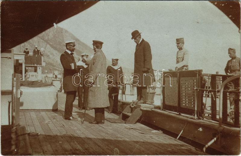 1916 Kotor, Cattaro; SMS BLITZ Osztrák-Magyar Monarchia Komet-osztályú torpedóhajója (őrhajója) fedélzete Mirkó montenegrói herceg látogatásakor, kapitány, matrózok és katonák / K.u.K. Kriegsmarine / Austro-Hungarian Navy Komet-class torpedo boat's deck during the arrival of Prince Mirko of Montenegro, captain, mariners and soldiers. photo
