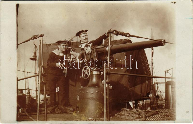 Beschreibung: Dunaflottilla gyorstüzelő fegyvere matrózokkal, 44 mm Skoda gyorstüzelő / K.u.K. Kriegsmarine Donauflottille Schnellfeuer-Geschütz / Austro-Hungarian Navy River Guard ship's rapid-fire gun with mariners. photo (fl)