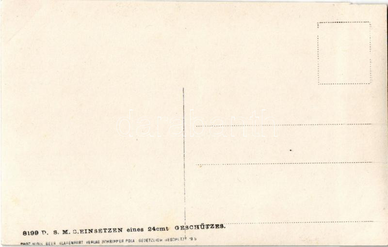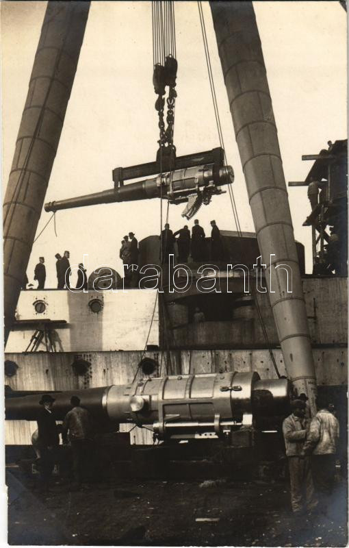 K.u.K. Kriegsmarine SMS Einsetzen eines 24 cm t Geschützes / Osztrák-Magyar haditengerészeti fegyver beszerelése daruval / Austro-Hungarian Navy, installation of a gun battery. Phot. Alois Beer. Verlag Schrinner, Pola 1915.