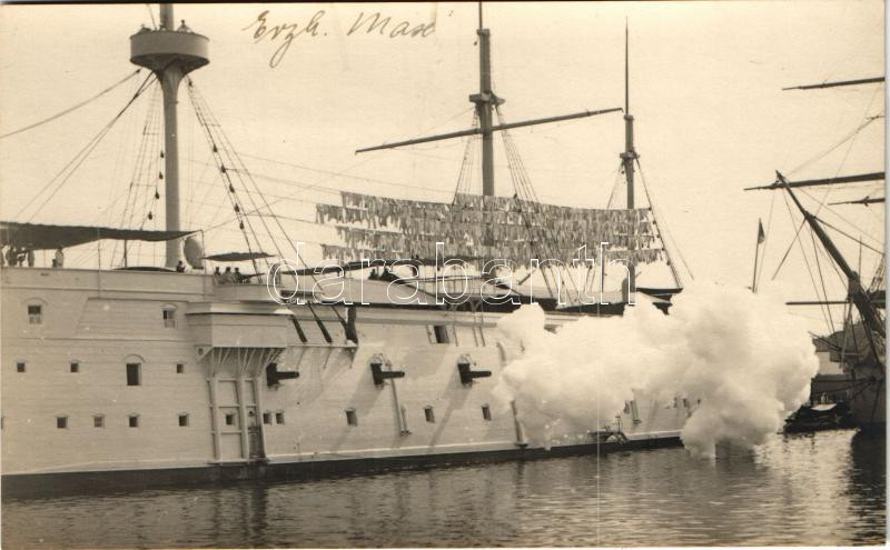 K.u.K. Kriegsmarine SMS Erzherzog Ferdinand Max / Cs. és kir. haditengerészet SMS Erzherzog Ferdinand Max páncélos csatahajója, ruhák száradnak a hajókötélen / Austro-Hungarian Navy ironclad battleship. photo