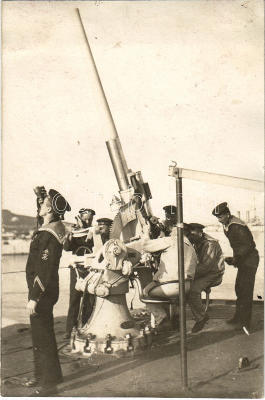 Osztrák-magyar haditengerészet lőgyakorlata 66 mm-es légvédelmi fegyverrel, matrózok / K.u.K. Kriegsmarine Matrosen / WWI Austro-Hungarian Navy mariners during practice shooting of a three-inch anti-aircraft gun. photo (r)