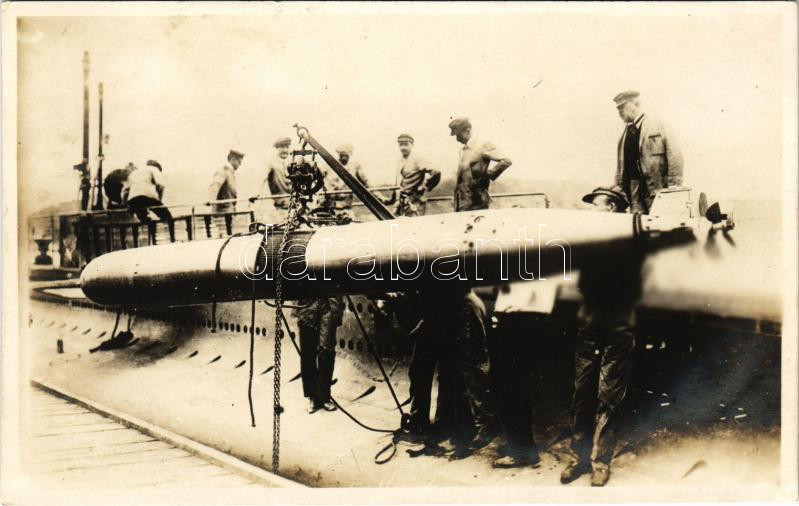 Osztrák-magyar matrózok próbálnak egy torpedót beemelni egy tengeralattjáróra / K.u.K. Kriegsmarine Unterseeboot / WWI Austro-Hungarian Navy mariners trying to load a torpedo onto a submarine. photo