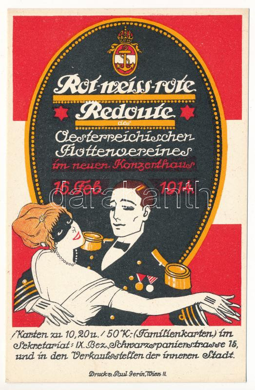 Rot-weiss-rote Redoute des Oesterreichischen Flottenvereines im neuen Konzerthaus 16. Feb. 1914. - Druck v. Paul Gerin, K.u.k. Kriegsmarine / Osztrák-Magyar Monarchia haditengerészeti báljának a meghívója / Austro-Hungarian Navy ball's invitation