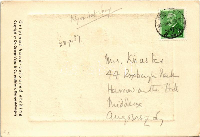 1937 Magyar népművész lap. Eredeti kézzel festett rézkarc / Hungarian folk art, original hand-coloured etching. Copyright by Dr. George Vajna & Co. (non PC) (EK)