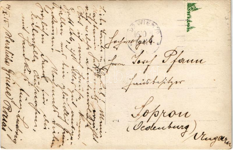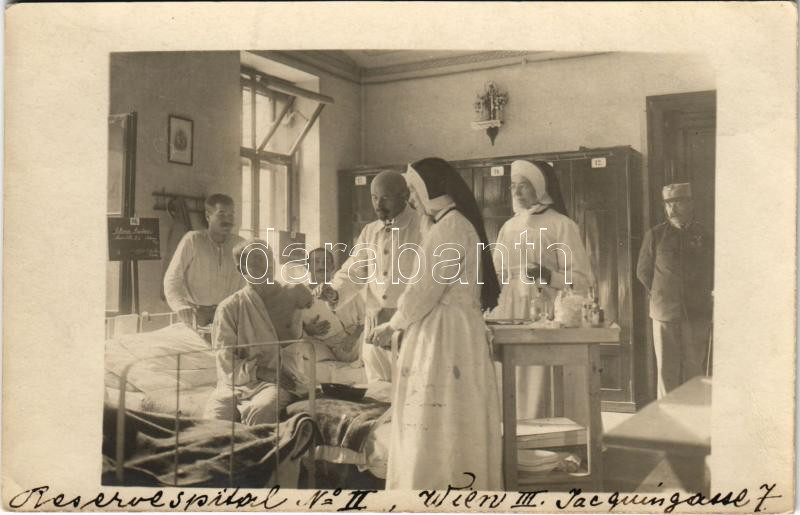 1915 Wien, Vienna, Bécs III. Reservespital No. II. Jacquingasse 7. / Osztrák-magyar katonai kórház belső, Sikora Andreas katona amputált karral, doktor és nővérek / WWI K.u.k. military hospital interior, soldier with amputated arm. photo (EK)