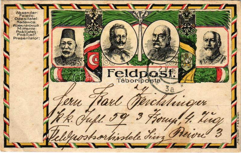 1916 Első világháborús tábori postai levelezőlap a Központi Hatalmak uralkodóival: V. Mehmed, I. Ferdinánd, II. Vilmos, I. Ferenc József / WWI Austro-Hungarian K.u.K. military field postcard, Viribus Unitis and Central Powers propaganda: Mehmed V, Ferdinand I of Bulgaria, Wilhelm II, Franz Joseph I of Austria. Feldpostkarte (EB)