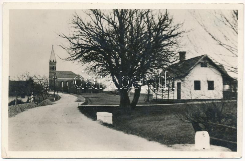 Beschreibung: Nagytótlak, Lak, Lakszentmiklós, Selo; utcakép a templommal / street view with church (EK)
