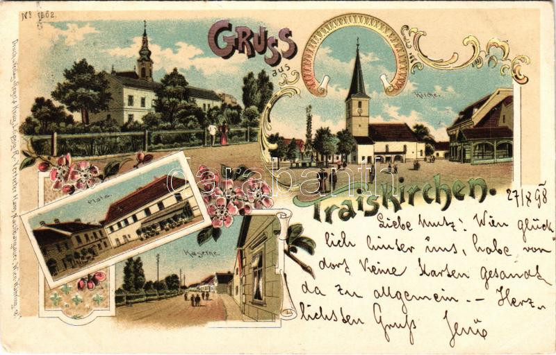 Beschreibung: 1898 (Vorläufer) Traiskirchen, Platz, Kaserne, Kirche / square, military barrack, church. Regel & Krug Art Nouveau, floral, litho (wet damage)