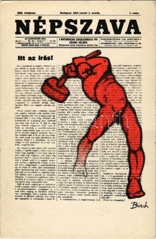 Népszava. Itt az írás! A Magyarországi Szociáldemokrata Párt Központi Közlönye. Munkásosztály propaganda, Seidner Chromolithographia. Népszava Könyvkereskedés kiadványa / Hungarian newspaper advertisement, working class propaganda s: Biró
