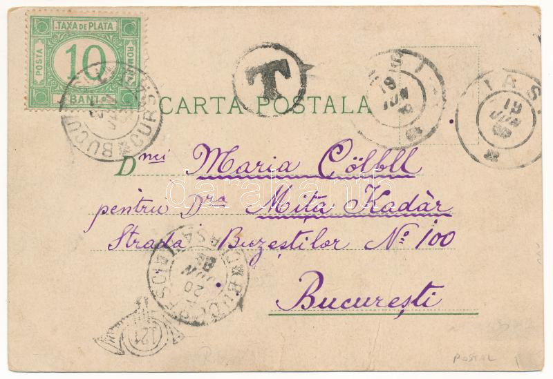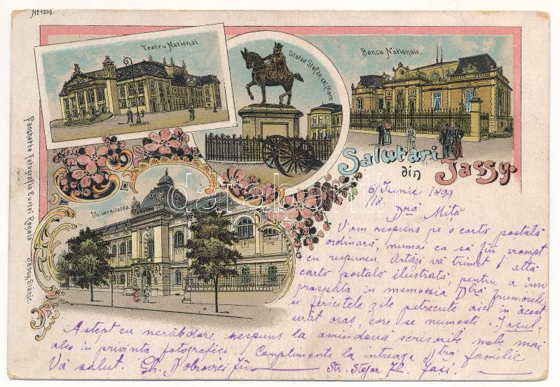 1899 (Vorläufer) Iasi, Jasi, Jassy, Jászvásár; Teatru National, Universitatea, Statua Stefan cel Mare, Banca Nationale. Fanchette No. 1209. / theatre, university, statue, bank. Art Nouveau, floral, litho (tear)