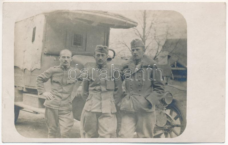 Beschreibung: 1918 Radauti, Radóc, Radautz (Bukovina, Bukowina); osztrák-magyar katonák katonai teherautó előtt / WWI K.u.k. soldiers on front of a military truck. photo