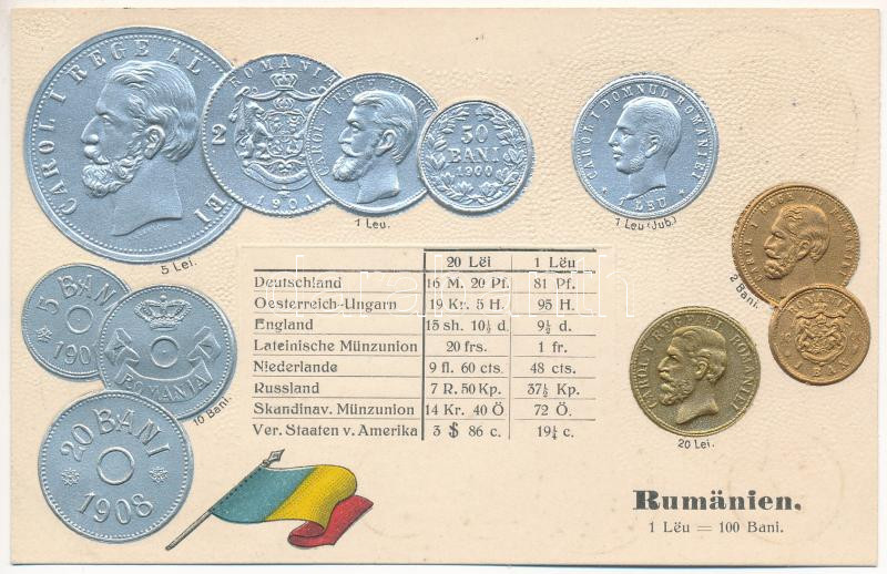 Rumänien - Münzenkarte / Románia - érmék és zászló. Dombornyomott / Ro... https://www.darabanth.com/de/41-Gross-Auktion/41.1/Ansichtskarten/Rumanien~17046/Rumanien-Munzenkarte-Romania-ermek-es-zaszlo-Dombornyomott-Romanian-coins-and-flag~II3006953