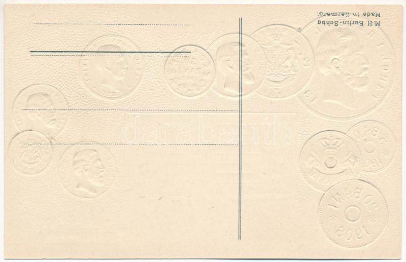 Beschreibung: Rumänien - Münzenkarte / Románia - érmék és zászló. Dombornyomott / Romanian coins and flag. M.H. Berlin-Schbg. Embossed