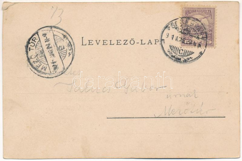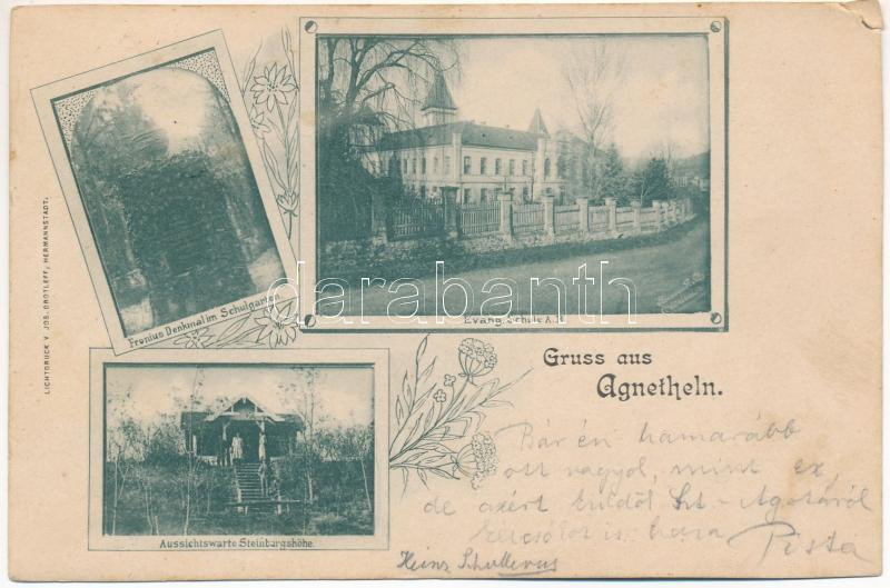1901 Szentágota, Agnetheln, Agnita; Evang. Schule A.B., Fronius Denkmal im Schulgarten, Aussichtswarte Steinburgshöhe / Evangélikus templom, szobor, kilátó. Jos. Drotleff / Lutheran school, monument, look-out place. Art Nouveau, floral (EK)