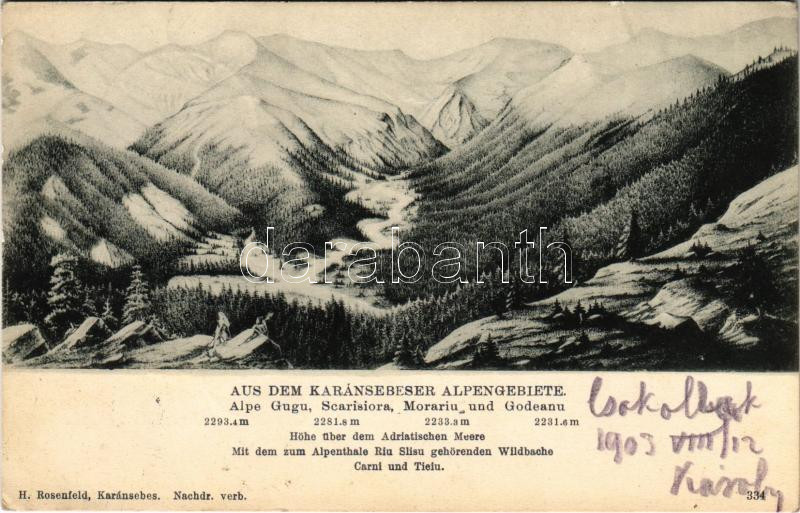 Beschreibung: 1903 Karánsebes, Caransebes; Aus dem Karánsebeser Alpengebiete. Alpe Gugu, Scarisiora, Morariu und Godeanu / Karánsebesi hegyek. H. Rosenfeld kiadása / mountains (EK)