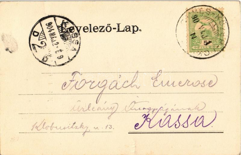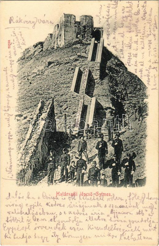 1904 Gyimesbükk, Ghimes-Faget (Gyimes, Ghimes); Határszéli lépcsők és a Rákóczi vár, csendőrök. Szvoboda József kiadása / stairs by the border, castle ruins, gendarmes