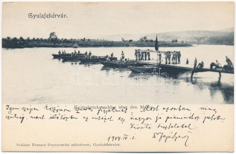 1904 Gyulafehérvár, Karlsburg, Alba Iulia; Kriegsbrückenschlag über den Maros / hidászok ideiglenes katonai hajóhíd építése közben. Schäser Ferenc kiadása / K.u.k. soldiers building a military pontoon bridge (EK)