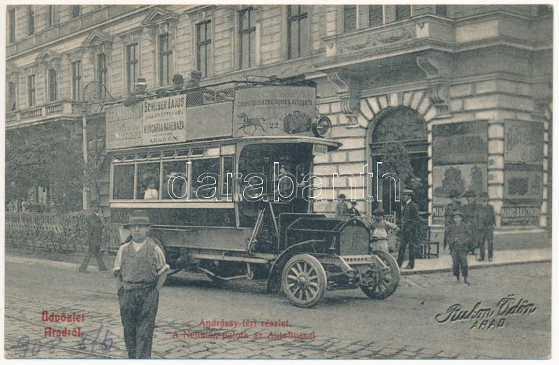 1908 Arad, Andrássy tér, Neuman Palota, autóbusz (rajta Scheiber Lajos... https://www.darabanth.com/de/41-Gross-Auktion/41.1/Ansichtskarten/Siebenburgen~16959/1908-Arad-Andrassy-ter-Neuman-Palota-autobusz-rajta-Scheiber-Lajos-vasuti-etterme-es-a-Hun~II3006236