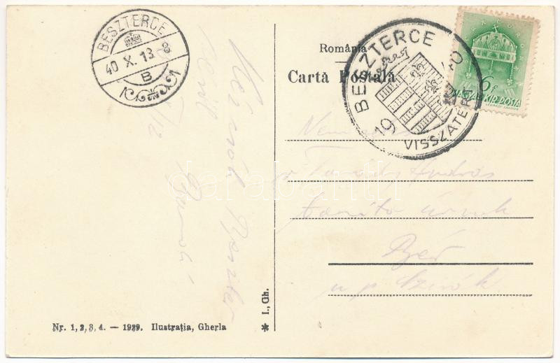 Beschreibung: 1940 Beszterce, Bistritz, Bistrita; Fritsch szálloda és belseje, kert, autóbusz / hotel and interiors, garden, bus + "1940 Beszterce visszatért" So. Stpl