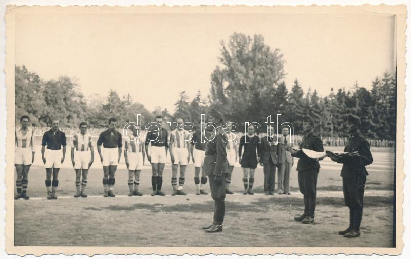 1940 Kolozsvár, Cluj; Magyarország B válogatott - Kolozsvár válogatott 2:1 (1:0), labdarúgók, focisták csoportja, magyar katonák / football teams, group of players and Hungarian soldiers. photo (EK)