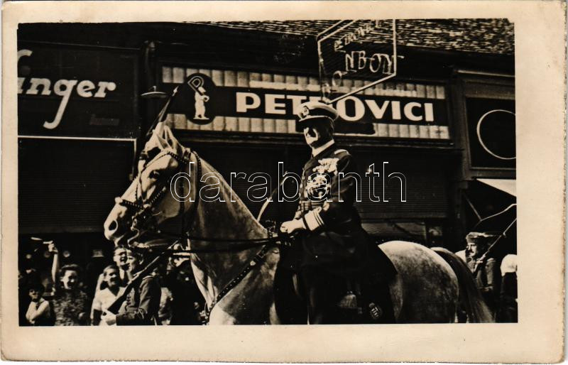 1940 Nagyvárad, Oradea; bevonulás, Horthy Miklós fehér lovon Petrovici üzlete előtt / entry of the Hungarian troops, Horthy on white horse, shops. photo + "1940 Nagyvárad visszatért" So. Stpl