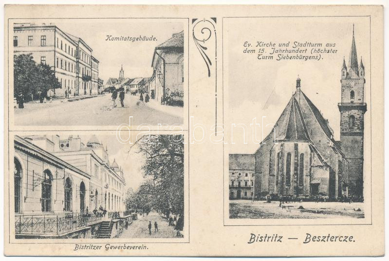 Beszterce, Bistritz, Bistrita; Komitatsgebäude, Ev. Kirche und Stadtturm aus dem 15. Jahrhundert (höchster Turm Siebenbürgens), Bistritzer Gewerbeverein / Vármegyeháza, Evangélikus templom és várostorony a 15. századból (legmagasabb erdélyi várostorony), Ipartársulat / county hall, church and city tower from the 15th century, trade association's building (fl)