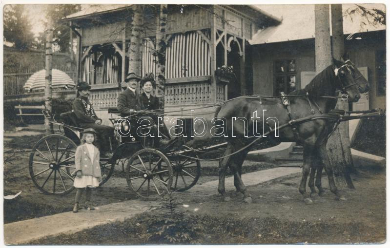 Beschreibung: Gyergyólibántelep, Libán (Gyergyóújfalu, Suseni); Vadász kastély (?), lovashintó, vadász puskával / Hunting castle, horse chariot, hunter with gun. photo