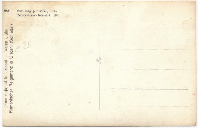 Hobicaurikány, Urikány, Uricani (Hunyad); Dans national la Valea Jiului / Rumänischer Reigentanz in Schieltal / Román néptánc. Foto orig. J. Fischer Sibiu 1941 / Romanian folk dance (fl)