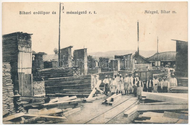 Mézged, Meziad; Bihari erdőipari és mészégető rt. telepe a munkásokkal... https://www.darabanth.com/de/41-Gross-Auktion/41.1/Ansichtskarten/Siebenburgen~16959/Mezged-Meziad-Bihari-erdoipari-es-meszegeto-rt-telepe-a-munkasokkal-fatelep-furesztele~II3006229