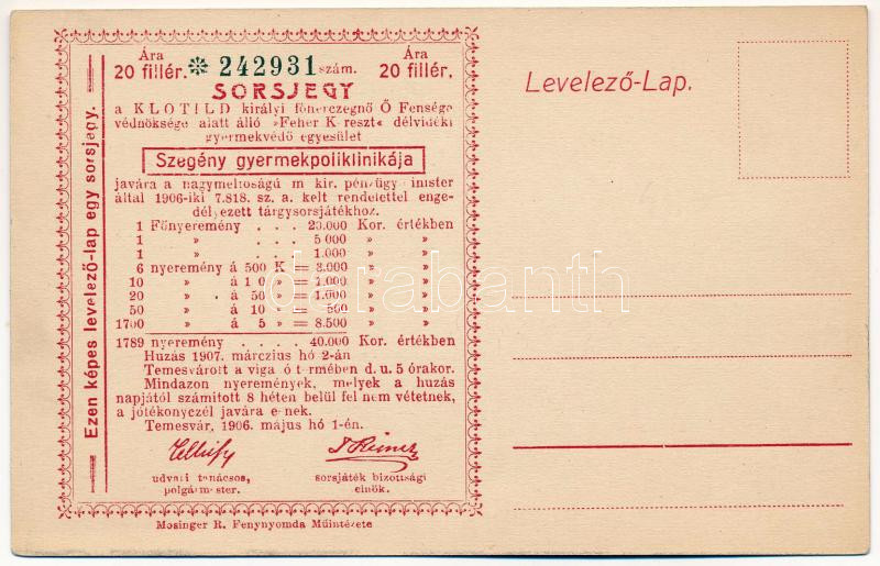 Beschreibung: Temesvár, Timisoara; Jenő herceg tér, Rukavina emlékmű, Agrár takarékpénztár. Hátoldalon sorsjegy a Szegény gyermekpoliklinika javára / square, monument, savings bank. Charity lottery ticket on the backside