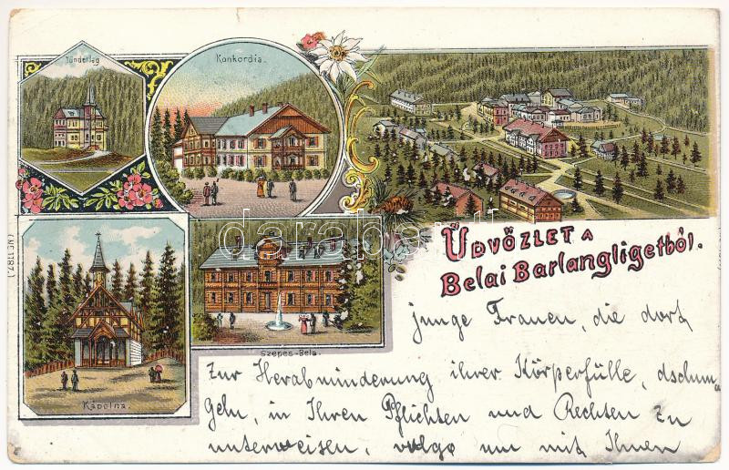1898 (Vorläufer) Barlangliget, Höhlenhain, Tatranská Kotlina (Magas-Tátra, Vysoké Tatry); Üdvözlet a Bélai barlangligetből! Tündérlak, Konkordia, Kápolna, Szepes-Béla, nyaralók, szállodák / villas, hotels, chapel. Art Nouveau, floral, litho (kis szakadás / small tear)