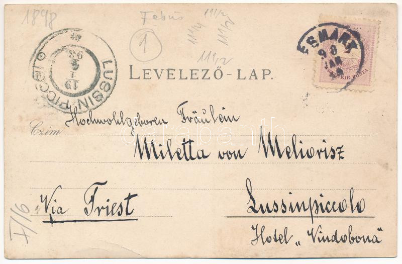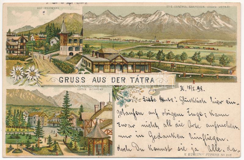 1898 (Vorläufer) Tátra, Tatry; Alt Schmeks, Unter-Schmeks, Die Central Karpathen gegen Poprad. E. Benigny No. 968. / Ótátrafüred és Alsótátrafüred, Központi Kárpátok / Stary and Dolny Smokovec, Carpathian Mountains. Art Nouveau, floral, litho (ázott / wet damage)