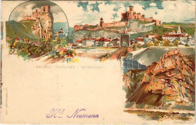 1899 (Vorläufer) Beckó, Trencsén, Sztrecsnó vár, kastély. Ezredéves Országos Kiállítás / Beckovsky Hrad, Trenciansky Hrad, Hrad Strecno / castles of Beckov, Trencín and Strecno. Hungarian Millennium Exhibition. barna 2 Kr. Ga., Art Nouveau, litho s: Kimnach (EK)