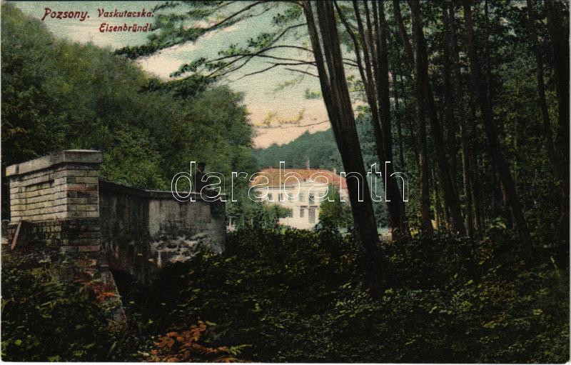 Beschreibung: 1908 Pozsony, Pressburg, Bratislava; Vaskutacska, fürdő szálló. Kaufmann's Bediene dich allein / Eisenbrünnel (Eisenbründl) / Zelezná Studienka / spa hotel