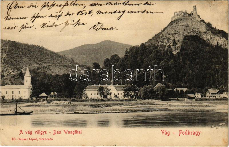 1912 Vágváralja, Vág-Podhragy, Povazské Podhradie (Vágbeszterce, Povazská Bystrica); Podrágyvár, templom, kastély, Vágvölgy. Gansel Lipót kiadása / castle, church in Váh Valley / Povazie, Povazsky hrad (EK)