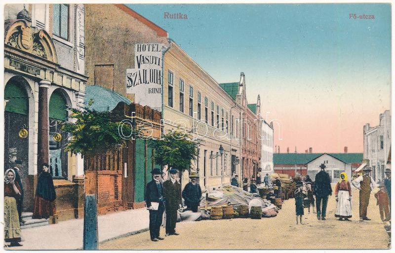 1916 Ruttka, Vrútky; Fő utca, Vasúti szálloda, piac. Vasúti levelezőlapárusítás 21. sz. 1915. / main street, railway hotel, market (ázott / wet damage)