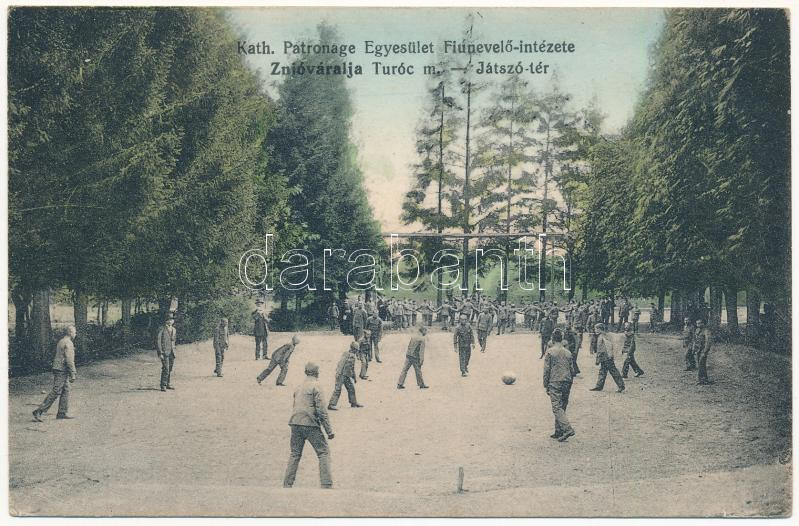 1917 Znióváralja, Klastor pod Znievom (Turóc); Kath. Patronage Egyesület fiúnevelő intézete, játszó tér, foci meccs, labdarúgó sport pálya / football match of the boy school (ázott / wet damage)