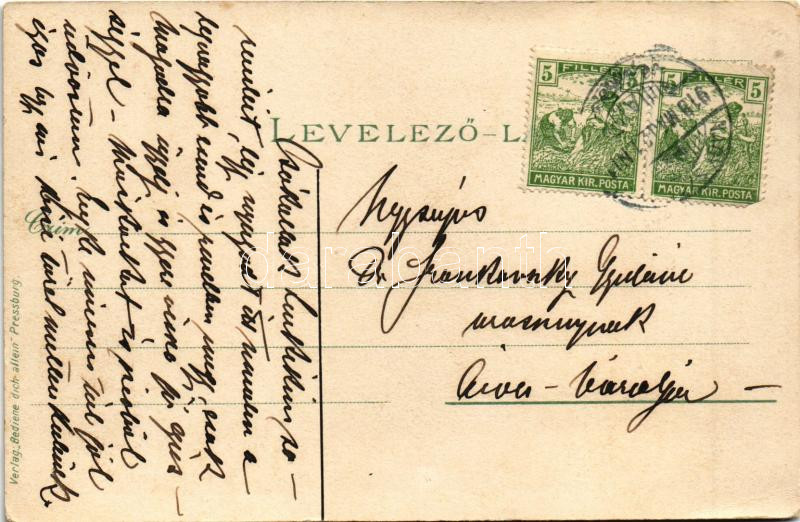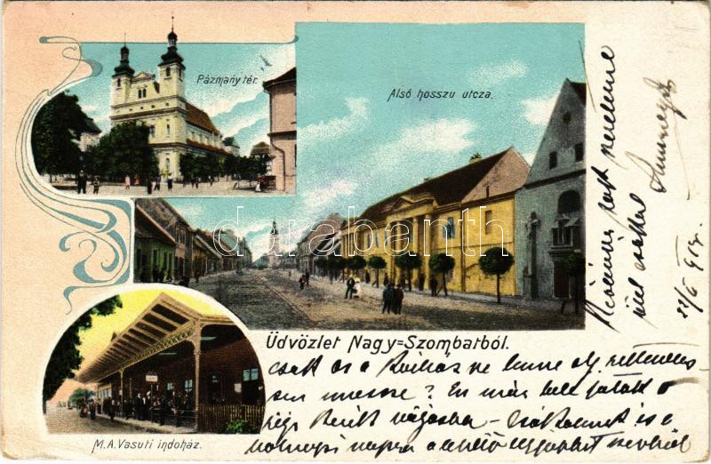 1918 Nagyszombat, Tyrnau, Trnava; Ferenc József tér, Várostorony, piac, üzletek, MÁV (Magyar Királyi Államvasutak) indóház, vasútállomás, Pázmány tér, templom. Verlag "Bediene dich allein" / square, city tower, market, shops, railway station, church. Art Nouveau (EK)