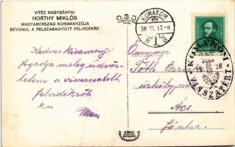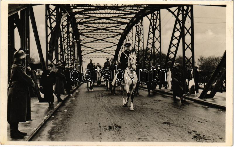 1938 Komárom, Komárno; bevonulás, Vitéz Nagybányai Horthy Miklós Magyarország kormányzója fehér lovon a hídon / entry of the Hungarian troops, Regent Horthy + "1938 Komárom visszatért" So. Stpl.