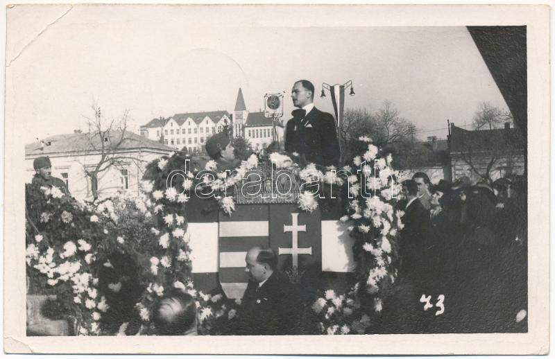 1938 Léva, Levice; bevonulás, Gróf Esterházy János beszéde / entry of ... https://www.darabanth.com/de/41-Gross-Auktion/41.1/Ansichtskarten/Slowakei~16960/1938-Leva-Levice-bevonulas-Grof-Esterhazy-Janos-beszede-entry-of-the-Hungarian-troops-Fo~II3007895